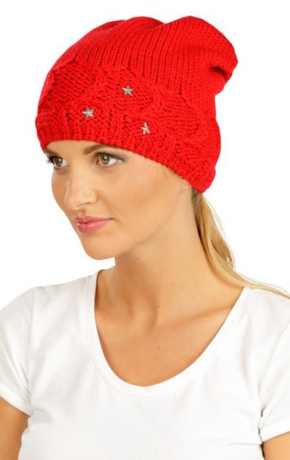 Dámská pletená zimní čepice zdobená hvězdičkami. Zajímavě řešený okraj čepice