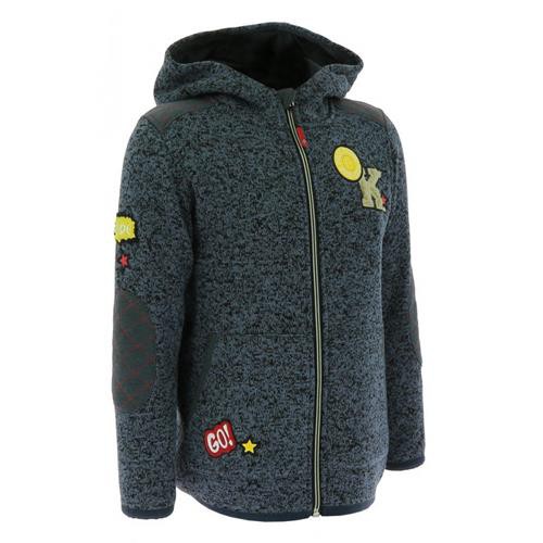 Dětská mikina v barvě modrého melíru s kapucí. Zapínání na zip. Postranní otevřené kapsy. Dětské motivy a nápisy na hrudi a pravém rukávu. Materiál: 100% polyester, vnitřek kapuce - 65% polyester, 35% bavlna