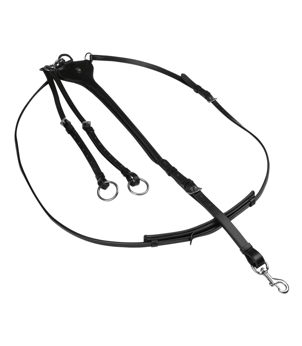 Martingale z měkké kůže s měkkým polstrováním v kohoutku. Odnímatelná a délkově nastavitelná martingale vidlice. Snadno se připevňuje k podbřišníku pomocí karabiny. S přezkami z nerezové oceli.