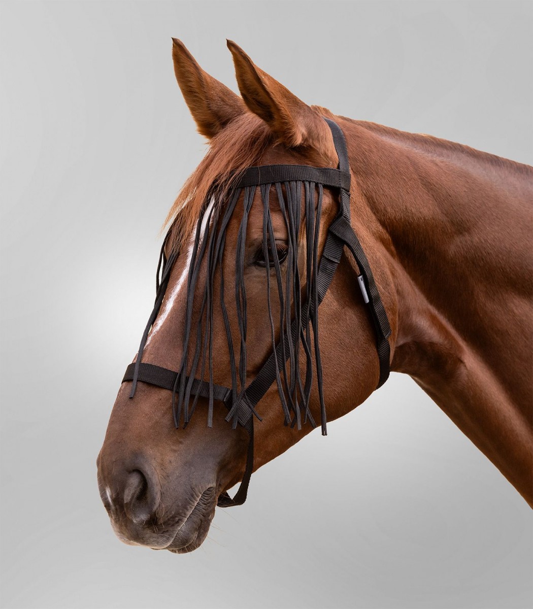 Ohlávka s třásněmi nabízí bezpečnost i pohodlí při pastvě. Integrované třásně chrání oči koně před otravnými mouchami. Díky suchému zipu na hlavici se ohlávka při tlaku uvolní, takže se kůň může v případě nouze osvobodit sám. Je obzvláště lehká a nemá žádné kovové prvky. Krční popruh je také zajištěn suchým zipem.
