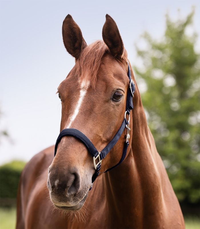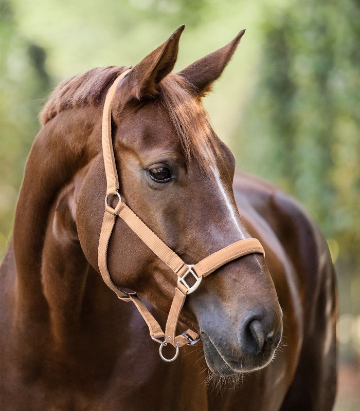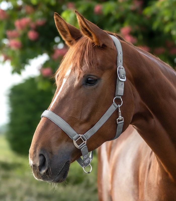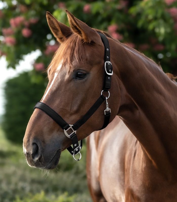 Nylonová ohlávka pro koně, 2x podložená neoprenem, 2x stavitelná pomocí přezky– nánosník a nátylník včetně otočné karabiny.