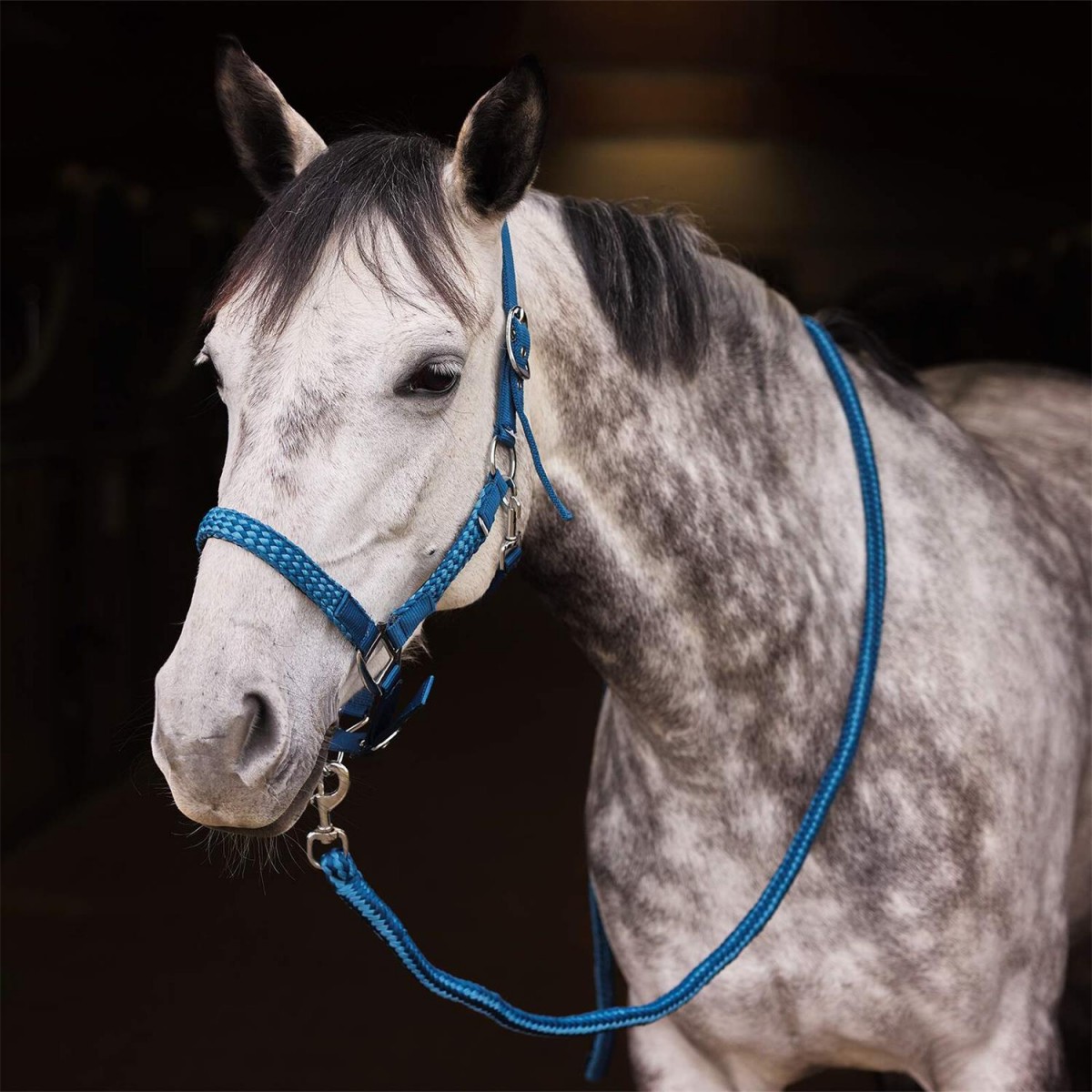 Stavitelná ohlávka značky Horze v modré barvě. Ohlávka je na dvou částích pletená. V setu s ohlávkou je 2,25 m dlouhé vodítko. Materiál: 100% polyester.
