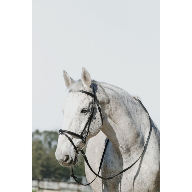 Ekonomy varianta uzdečky s otěžemi s anglickým kombinovaným nánosníkem pro koně. - nerezové kování - plátěné otěže s koženými zarážkami široké 1,5 cm - anglický kombinovaný nánosník - materiál: kůže