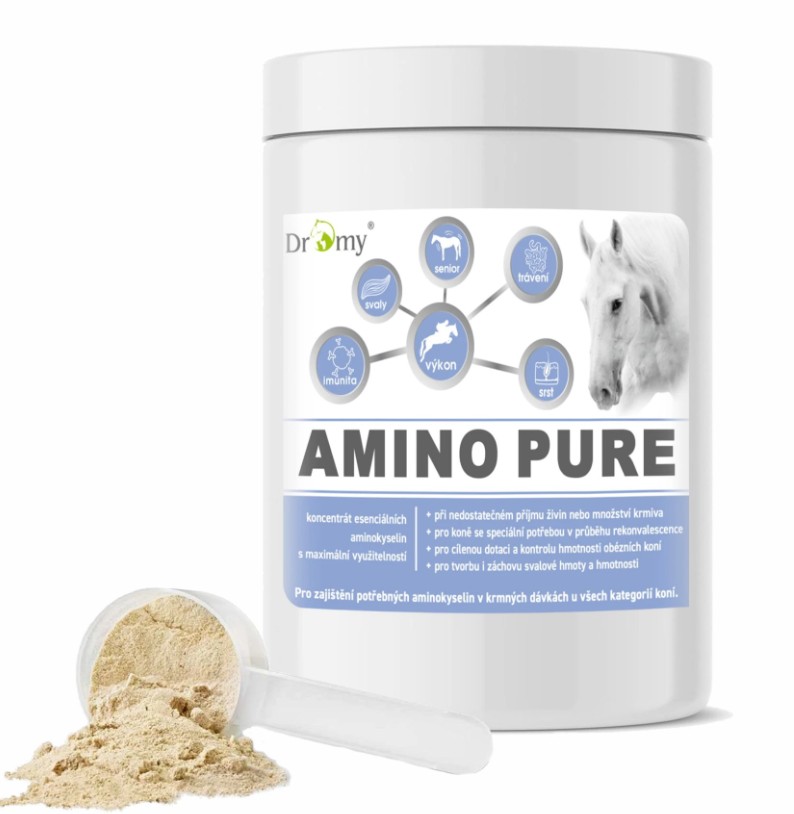 Amino PURE je sypké doplňkové krmivo s optimalizovaným profilem klíčových čistých 7 esenciálních aminokyselin v koncentrované formě a peptidů s rozvětveným řetězcem, které kůň dokáže 100% vstřebat a využít již v tenkém střevě. Lze jej podávat souběžně jakýmkoli krmivem, mineralizovaným krmivem a olejnatou složkou po nezbytně nutnou dobu i dlouhodobě. Nutričně vyvážené složení nabízí snadné a účinné řešení jak podpořit výživu vašeho koně v náročných situacích, s maximální vstřebatelností a využitelností nepostradatelných esenciálních aminokyselin.