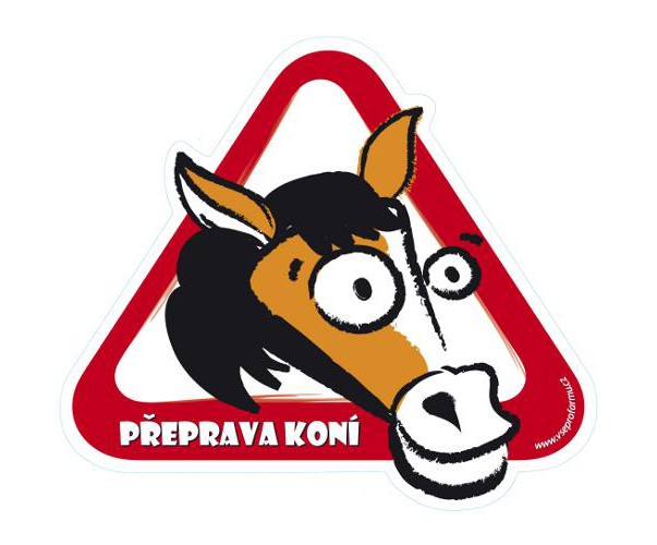 Výstražná samolepka "PŘEPRAVA KONÍ" trojúhelníkového tvaru výstražné dopravní značky s červeným orámováním. Sítotisk - cedulka nebledne.